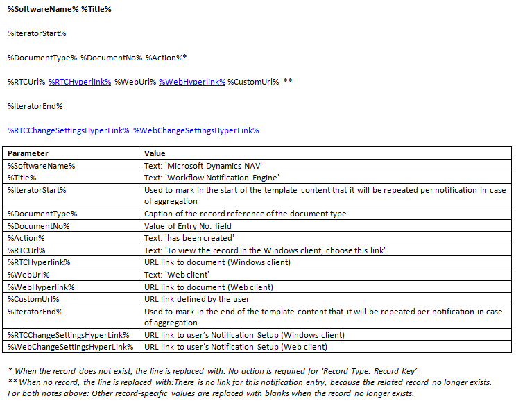 Parameterwerte werden entsprechend dem Typ der Benachrichtigungsvorlage automatisch in Benachrichtigungen eingefügt.
